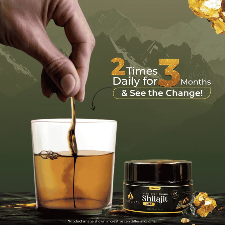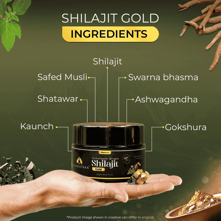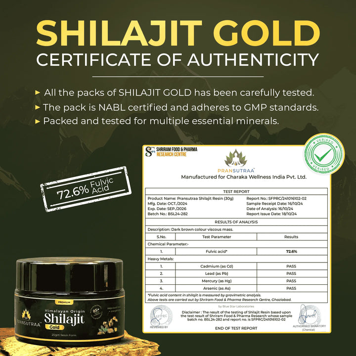 Our Pransutraa Shilajit Gold Resin is an NABL-certified lab product and follows GMP standards. It is rich in essential trace minerals, including potassium, calcium, iron, silica, and more. Pransutraa Shilajit Gold Resin, 100% Ayurvedic and Safe, also aids in improving protein and nutrient absorption, which may contribute to faster results.